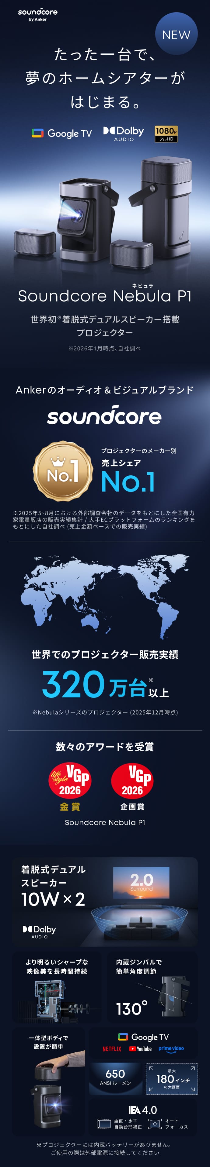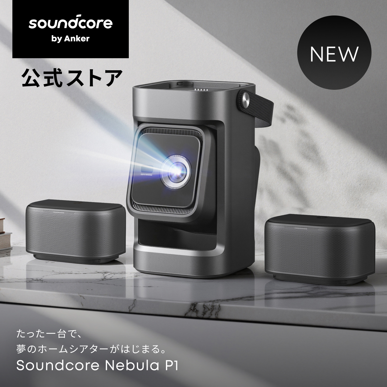 Anker Soundcore Nebula P1 (着脱式デュアルスピーカー搭載プロジェクター)【ホームシアター 家庭用 フルHD 650ANSIルーメン 立体音響 Netflix対応 天井投影】