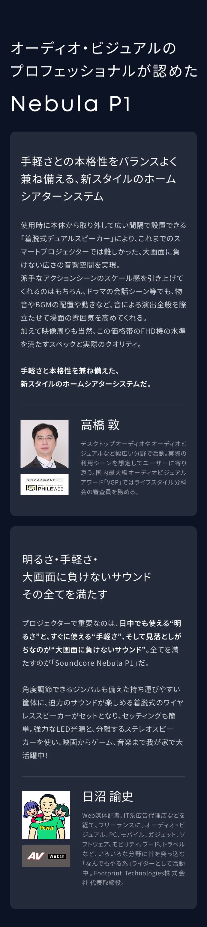 着脱式スピーカーによる双方向からの音響と、650ANSIルーメンの高輝度の映像で、さらに進化した映像没入体験を。今日からすぐに始められる、手軽なホームシアターをこの1台で
