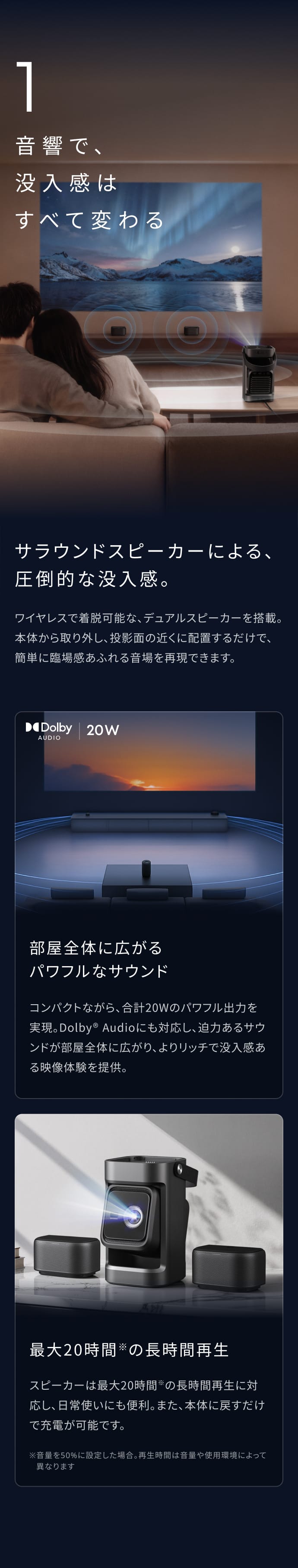合計20Wのスピーカーを投影面の近くに配置することで、双方向からクリアな音が、部屋全体に広がり、より進化した映像没入体験を。コンパクトながら、Dolby Audioに対応した臨場感あふれるサウンド。