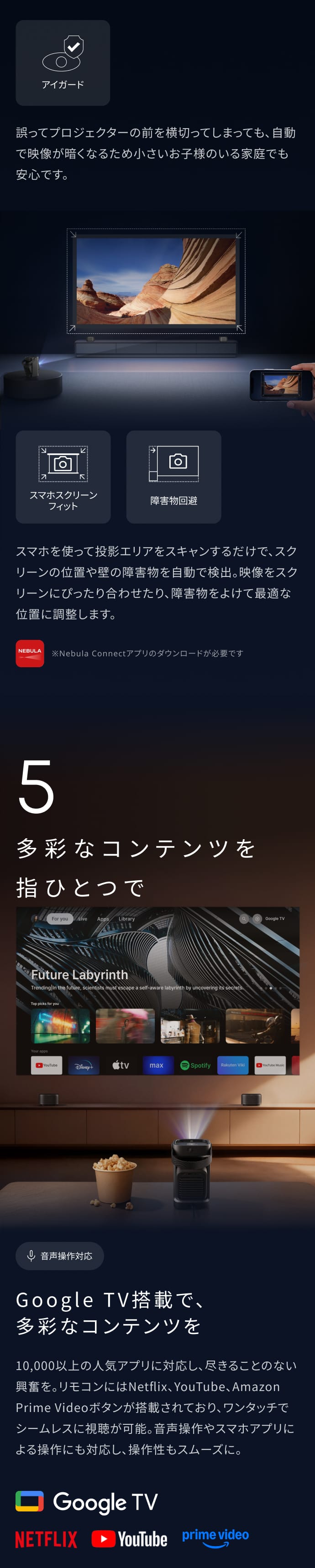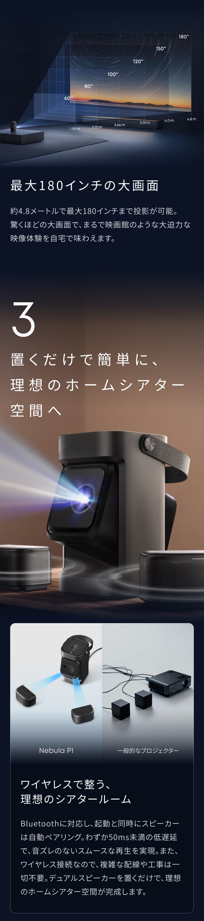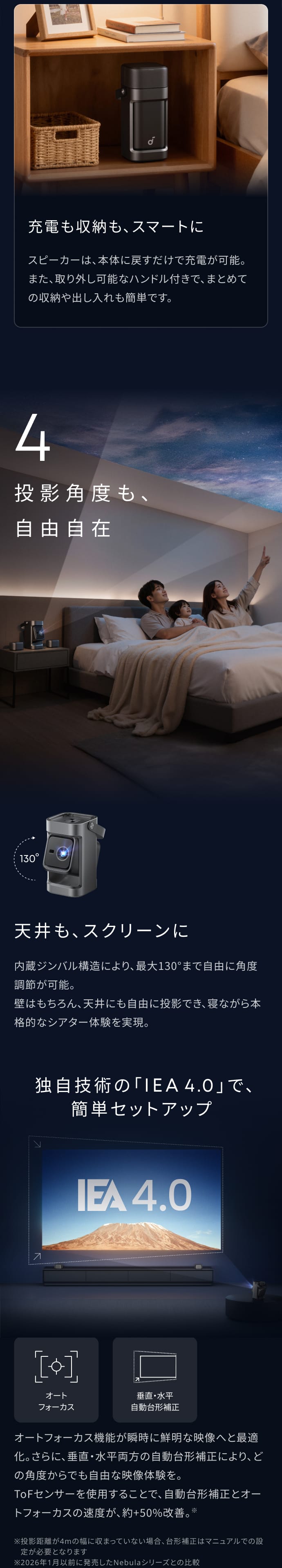独自技術の「IEA 4.0」搭載で、斜めからでも簡単に投影可能。オートフォーカスで常にくっきりとした映像美を。約4.8mで最大180インチまで投影可能で、大迫力な映像体験を自宅で