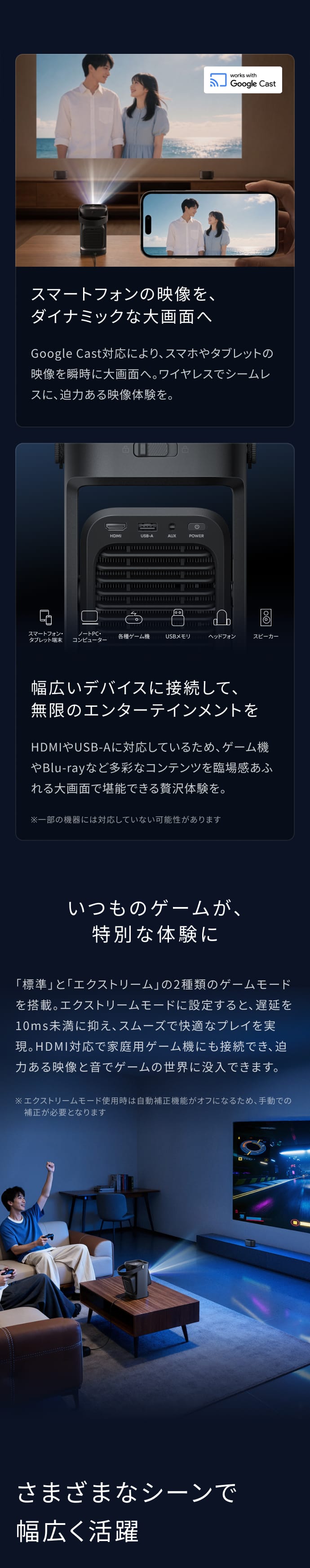 HDMI、AUX、USB-Aに対応しており、ゲームやDVDも大画面で楽しめます。 また、eARCにも対応しているため高音質のオーディオスピーカーにも繋げることができ、よりダイナミックな映像体験も楽しめます。