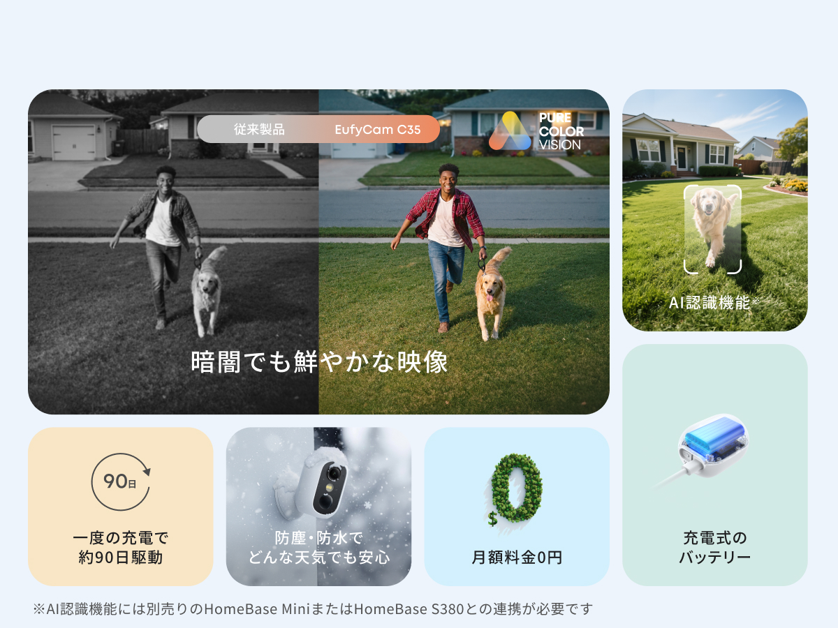 Q:eufyCam C35はHomeBase S380 / HomeBase Miniに接続可能でしょうか?はい、接続することでHomeBase S380 / HomeBase Miniのストレージの使用および顔認識や車両/ペット検出などのAI機能も使用可能になります。