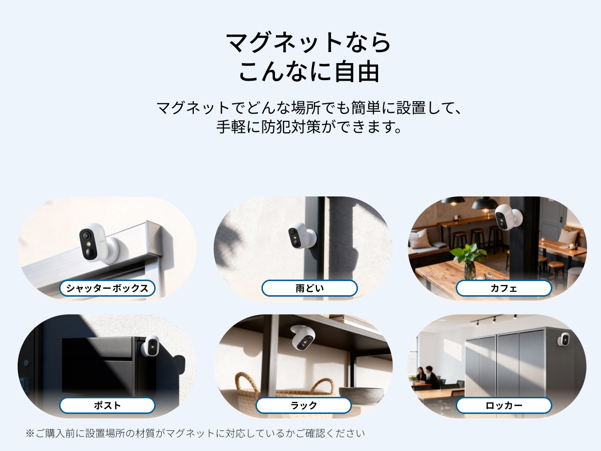 【マグネットで自由に取り付け】マグネットなら屋外・屋内問わずどんな場所でも簡単に設置でき、手軽に防犯対策ができます。取付金具での固定※、壁への取り付け、直置きなど様々な設置方法があります。