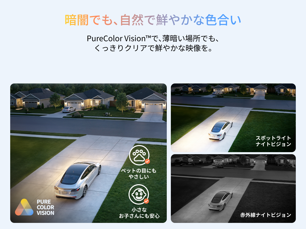 【暗闇でも自然で鮮やかな色合い】PureColor Visionで夜間でもスポットライトを使うことなくフルカラーで映像を確認できるため、お子様やペットの目にもやさしく、睡眠を邪魔することなく見守れます。