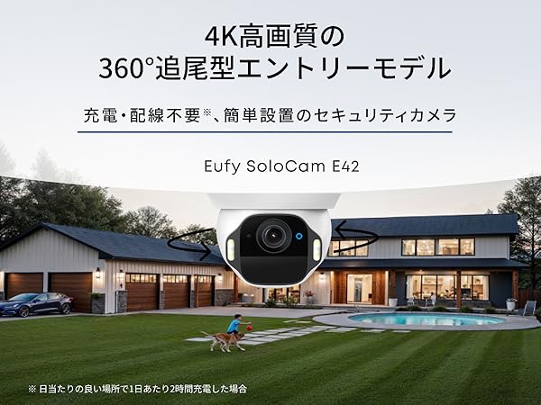 パッケージ内容Eufy SoloCam E42、ソーラーパネル、USB-C & USB-A ケーブル、位置決めステッカー、取り付けブラケット、取り付けネジパック x 2、取り付けブラケット (ソーラーパネル用)、クイックスタートガイド、カスタマーサポート