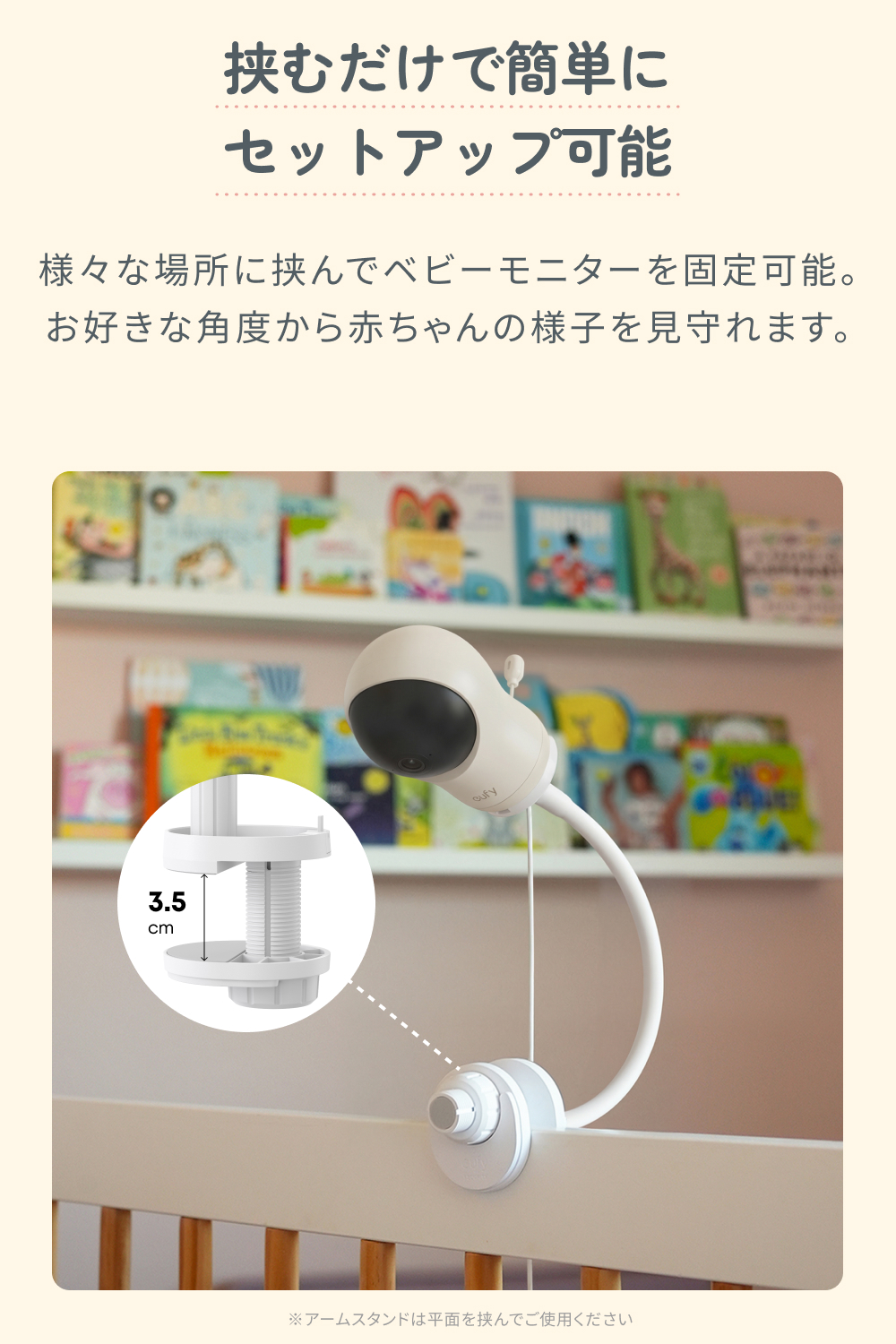 挟むだけで簡単にセットアップ可能様々な場所に挟んでベビーモニターを固定可能。お好きな角度から赤ちゃんの様子を見守れます。
