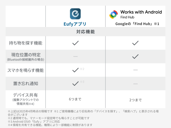・Eufy アプリ使用時の置き忘れ通知は、Bluetooth接続範囲を離れて約3分後に通知が届きます。使用環境によって通知が届くタイミングに差が出ます。