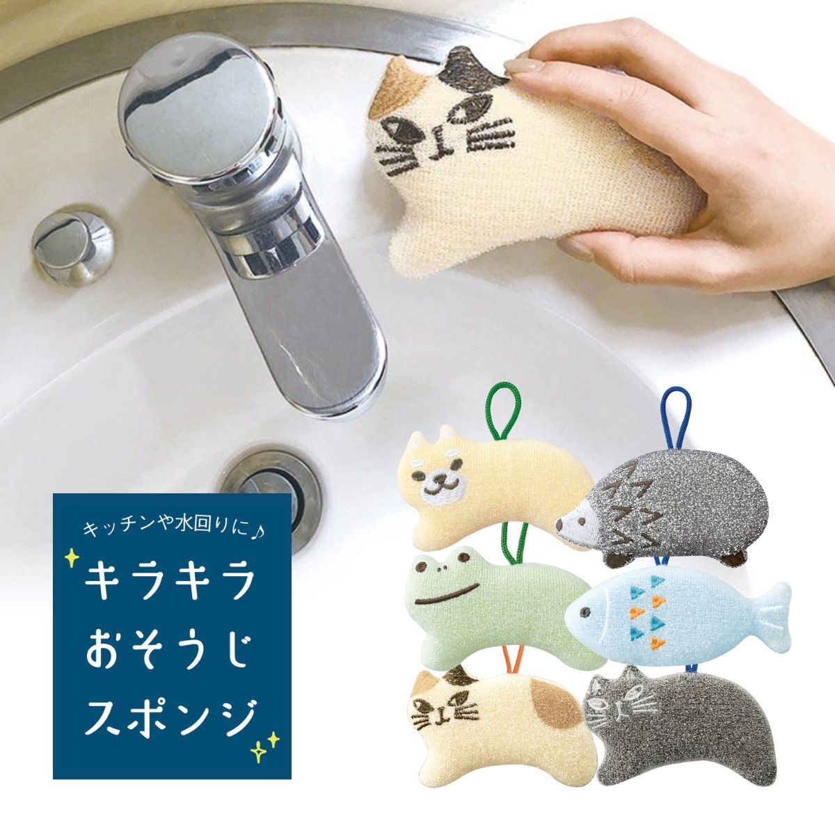キラキラおそうじスポンジ DECOLE デコレ 水回り用スポンジ アニマル 動物 ループ付き