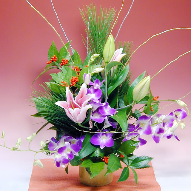 福の神は常緑樹に宿るといわれています。蘭とユリをいれた豪華なお正月の切花をセットいたしました。自分流に生けて楽しんでみてはいかがでしょうか。