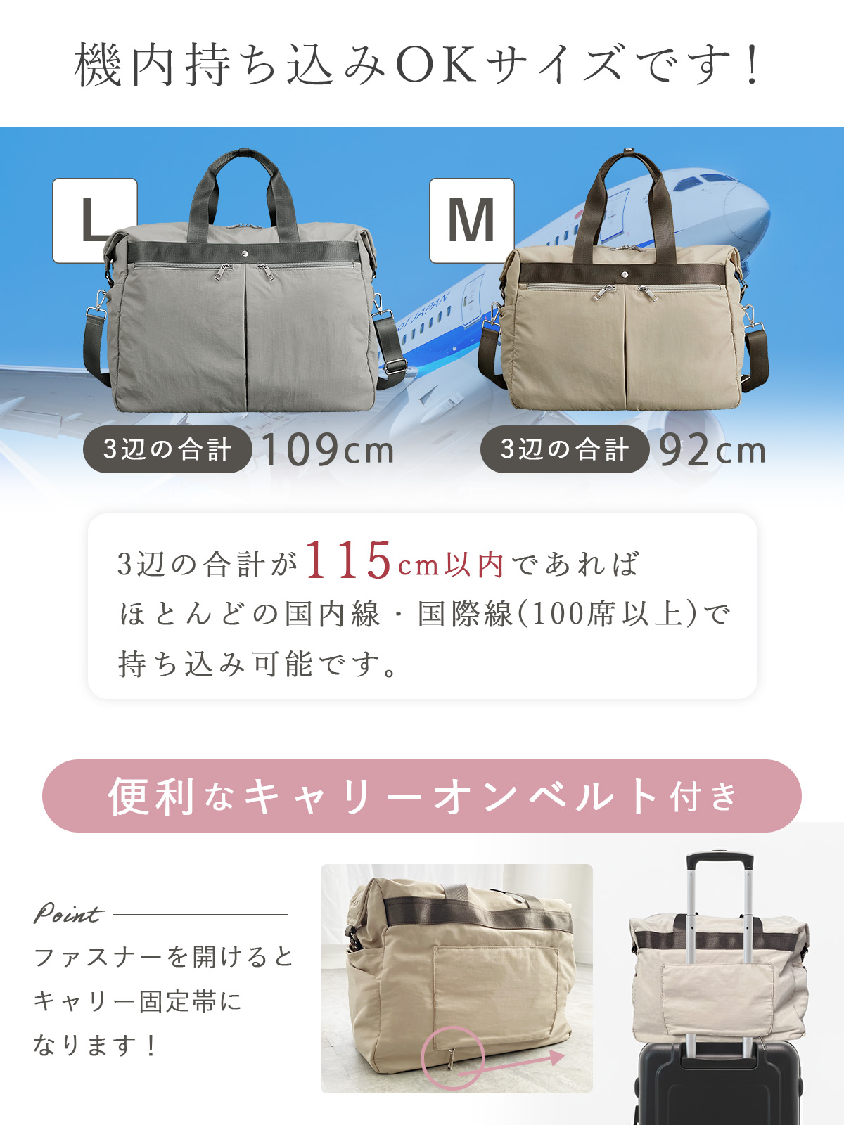 用途に合わせて選べるM、Lの2サイズ展開で、短期旅行から荷物の多い外出まで幅広く活躍。機内持ち込みサイズ対応。
