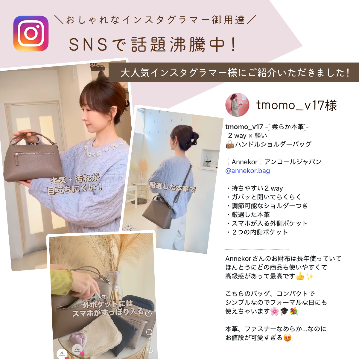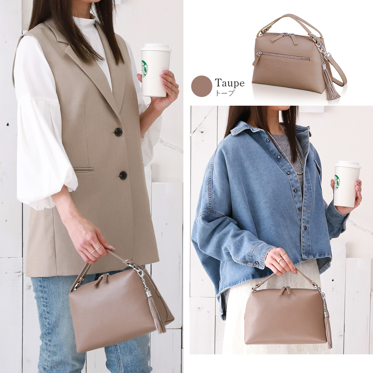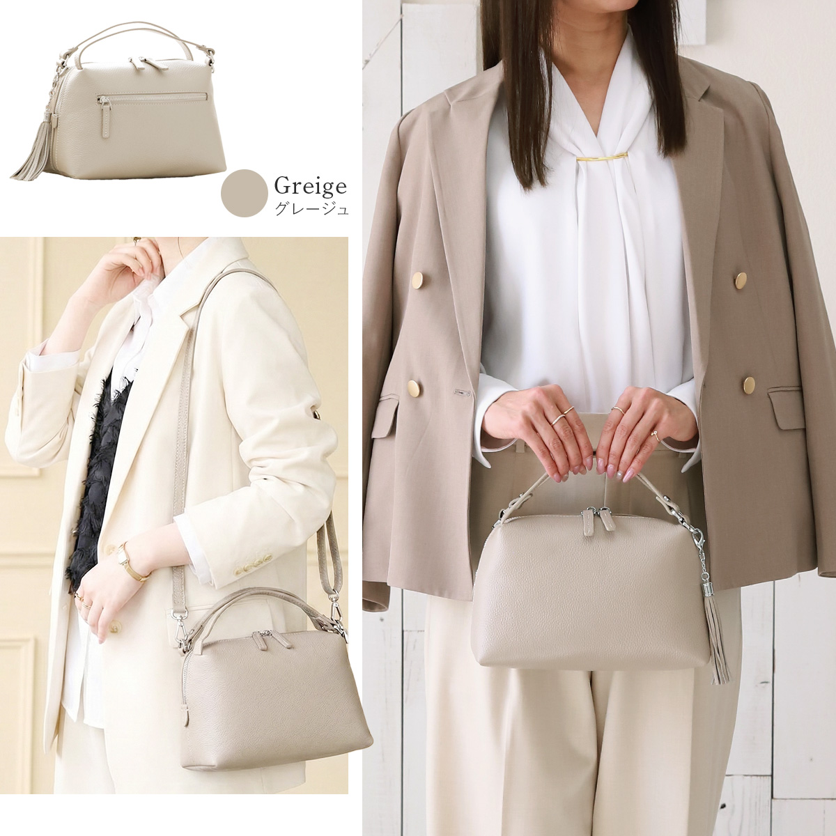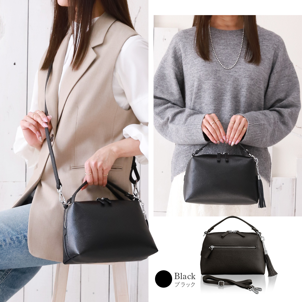 本体、ハンドル、ショルダーベルトすべてに手触り感抜群の厳選した牛本革を贅沢に使用。派手すぎず、落ち着いた質感で、きれいめコーデやフォーマルシーンにも自然になじみ、安心して永く使えます。