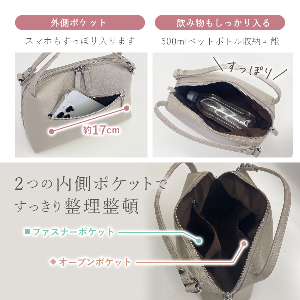 小さすぎず、大きすぎない。コンパクトな見た目ながら、長財布や500mlペットボトルもしっかり収納でき、お出かけ、通勤、学校行事などにも活躍。