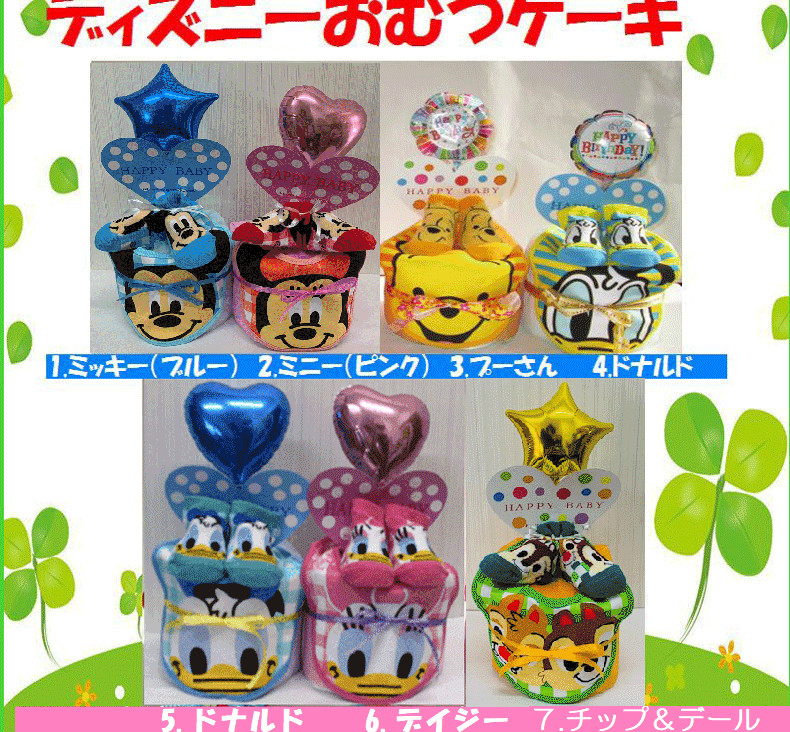 大人気のDisney(ディズニー)からミッキー、ミニー、プーさん、ドナルド他のおむつケーキです。