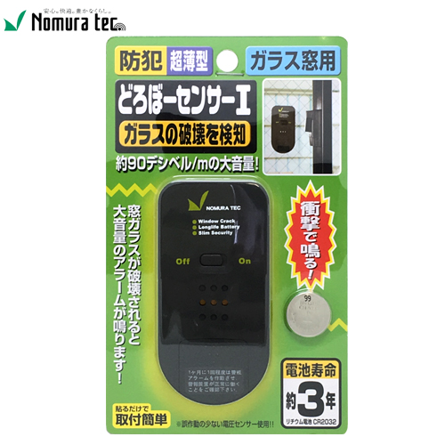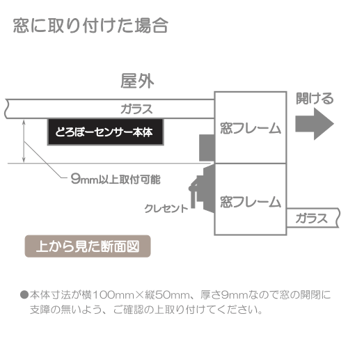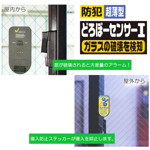 ガラス破壊を検知して警報音がなる薄型センサー。厚さ9mmなので窓ガラスの引き違いの隙間にも対応。※防犯効果向上の為、警報音は一度鳴ると約25秒間続きます。