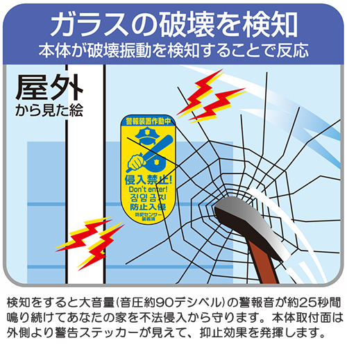 本体をガラス面に貼るだけで、侵入盗によるガラス破壊を見張ります。検知すると大音量(音圧約90デシベル)の警報音が約25秒間鳴り続けてあなたの家を不法侵入から守ります。本体取り付け面は外側より警告ステッカーが見えますので抑止効果を発揮します。電池寿命約3年