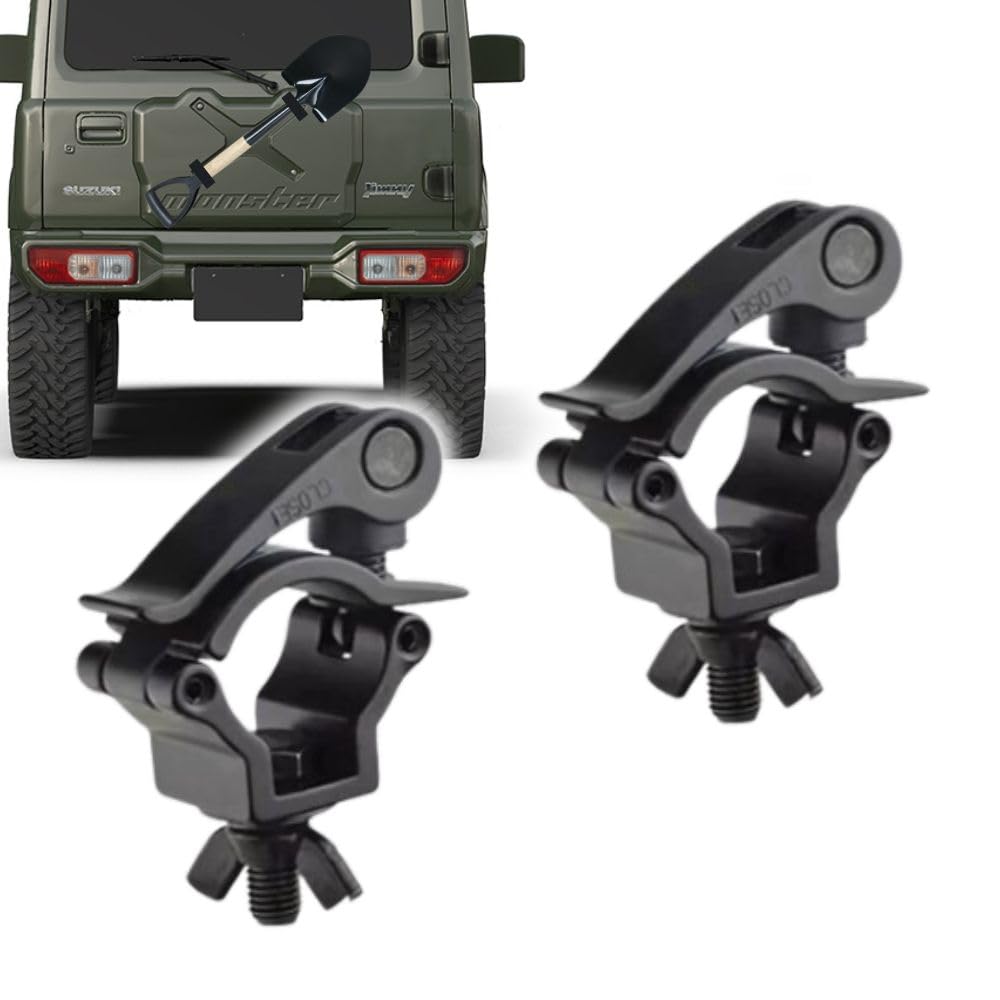 簡単取付 スコップホルダーはネジや専用工具を使わず、挟み込むだけで素早く取り付け可能。ジムニーや軽トラ、SUV、トラクターなど、さまざまな車種の背面タイヤやルーフラックにも対応。