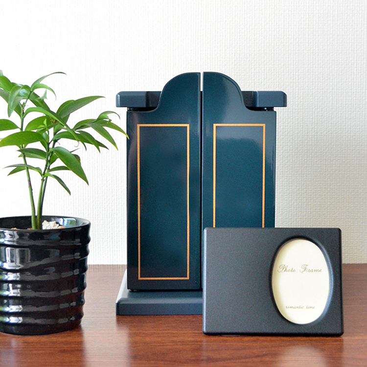 格式を大切にされる方には重厚感のあるやすらぎシリーズがお勧めです。濃紺の落ち着いた色合い、扉の表面は塗り職人が仕上げた鏡面塗り。それ以外は、すべてマット調の艶消し乾漆(ざらざら感)塗りを施しており、 指紋がつきにくくお手入れが簡単です。 素材は、MDF木製を使用。そこに、ウレタン塗装が施されています。 小さくても、漆器と同じ高品質な塗仕上げをしております。アーチ型の扉は観音開きで付属のフォトスタンドを入れることもできます。扉を閉めると、仏壇?と思うようなインテリア雑貨のようなフォルムです。天国のペット達が寂しがらないように家族が集う場所に設置しても違和感なくご利用頂けます。