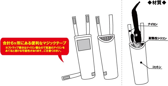 サロンでの施術中に高温になったアイロンを置いておくためのホルダーです。 ストラップ部分と本体に計6ヶ所のマジックテープが付いているので、様々な形のワゴンに取り付けてご使用いただけます。 ワゴンに取り付けて収納することができるので、施術スペースを有効活用することができます。 220℃まで対応。 ご使用上の注意 ※アイロンの電源を入れたままで長時間放置しないでください。アイロンホルダーが大変熱くなり危険です。 ※ストラップ部分はナイロンでできておりますので、高温のアイロンが当たらないようにしてください。 |