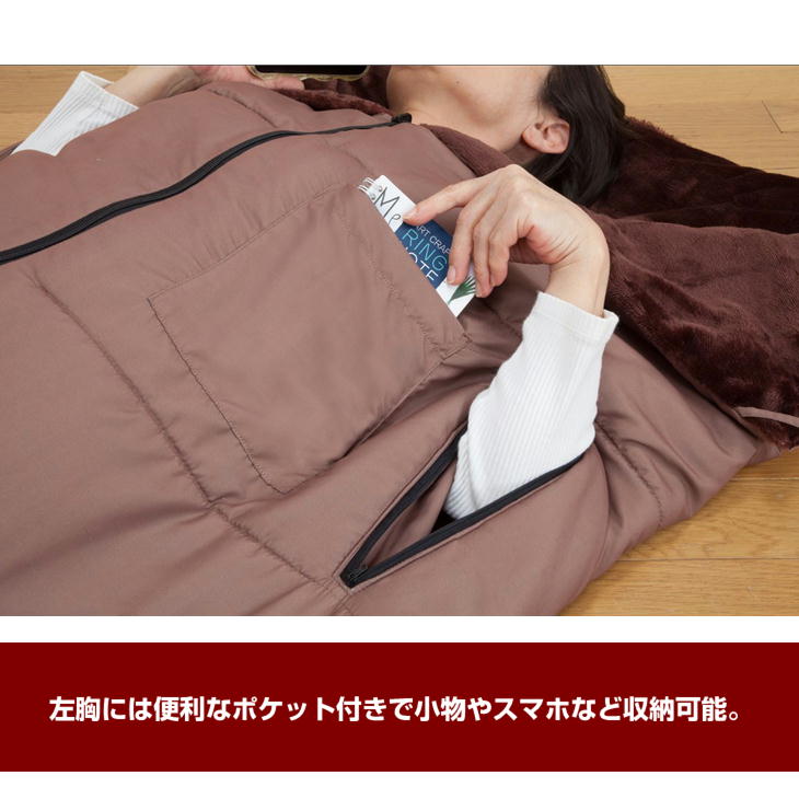 蓄熱アルミ蒸着シートが輻射熱効果を発揮し、体から放出された温度を反射蓄熱!これにより、暖かさが持続します。また、下からの冷気をシャットアウトする設計になっているため、冬のアウトドア活動や災害時の備えにも最適です。軽量で持ち運びにも便利なので、キャンプやハイキングだけでなく、車中泊やお家での使用にも対応しています。いつでもどこでも快適に眠れること間違いなし!腕出しファスナーを採用しているので、寝袋に入ったまま動くことができ、作業やスマホ操作も楽々。さらに、左胸には便利なポケット付きで小物やスマホなど収納可能。収納袋も付いているため、移動や保管も簡単です。