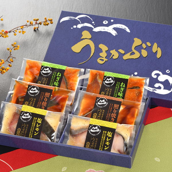 熊本県天草育ちの水揚げされたばかりの新鮮な「うまかぶり」をねぎ味噌、照り焼き、塩レモンの3種類のたれに漬け込みました。 脂ののった「うまかぶり」とそれぞれのたれの風味が楽しめます。