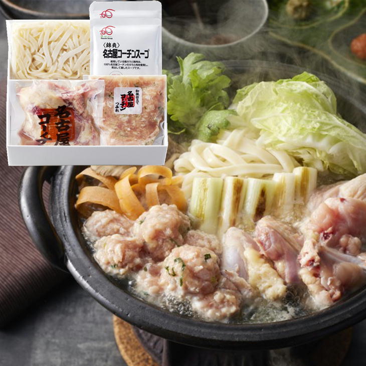 セット内容:名古屋コーチン骨付きぶつ切 200g、名古屋コーチンつみれ 200g、きしめん 200g、名古屋コーチンスープ 200g×2。
