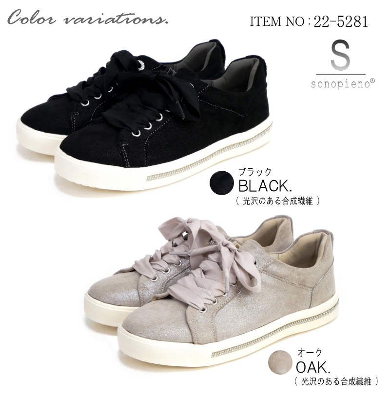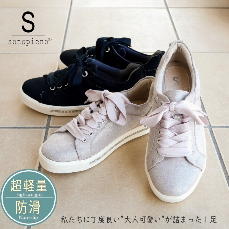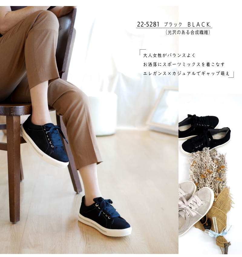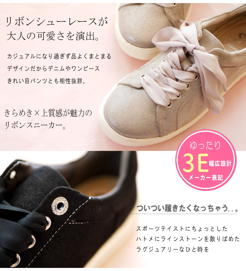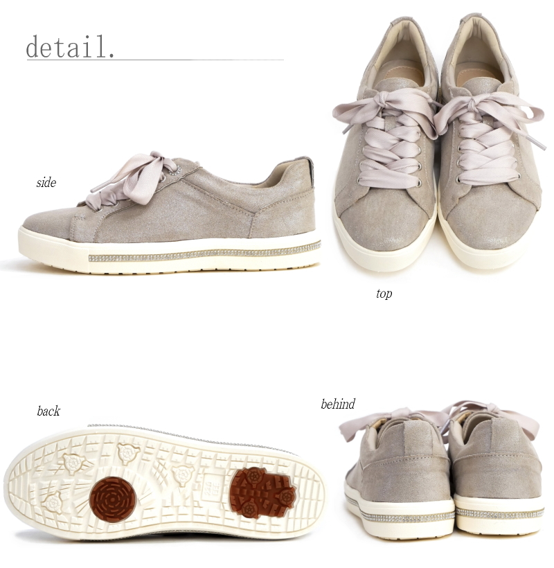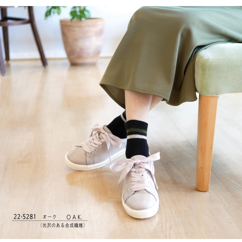 上品な煌めきとリボン風のシューレースで魅せる大人カジュアルスニーカー
