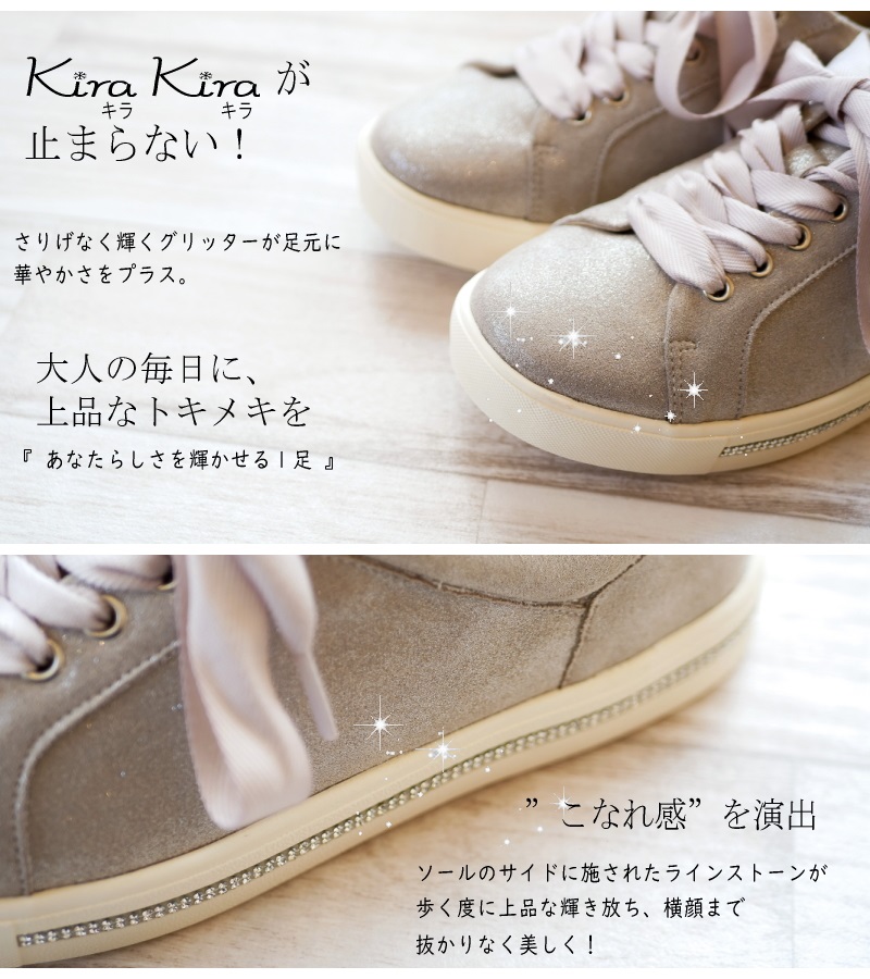 アッパーには、さりげなく輝くグリッター素材が足元に華やかさをプラス!