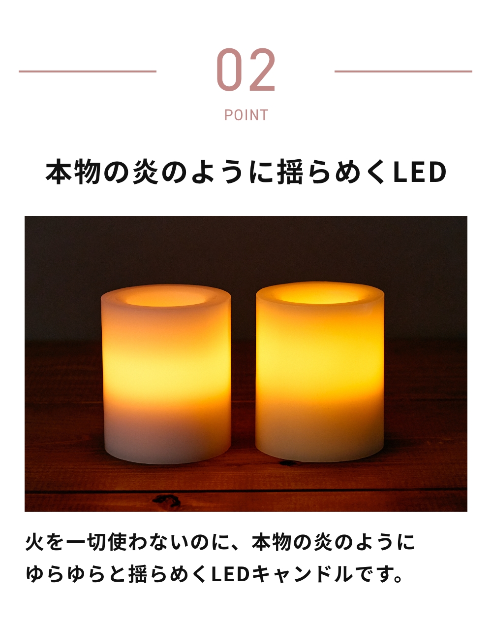 火を一切使わないのに、本物の炎のようにゆらゆらと揺らめくLEDキャンドルです。