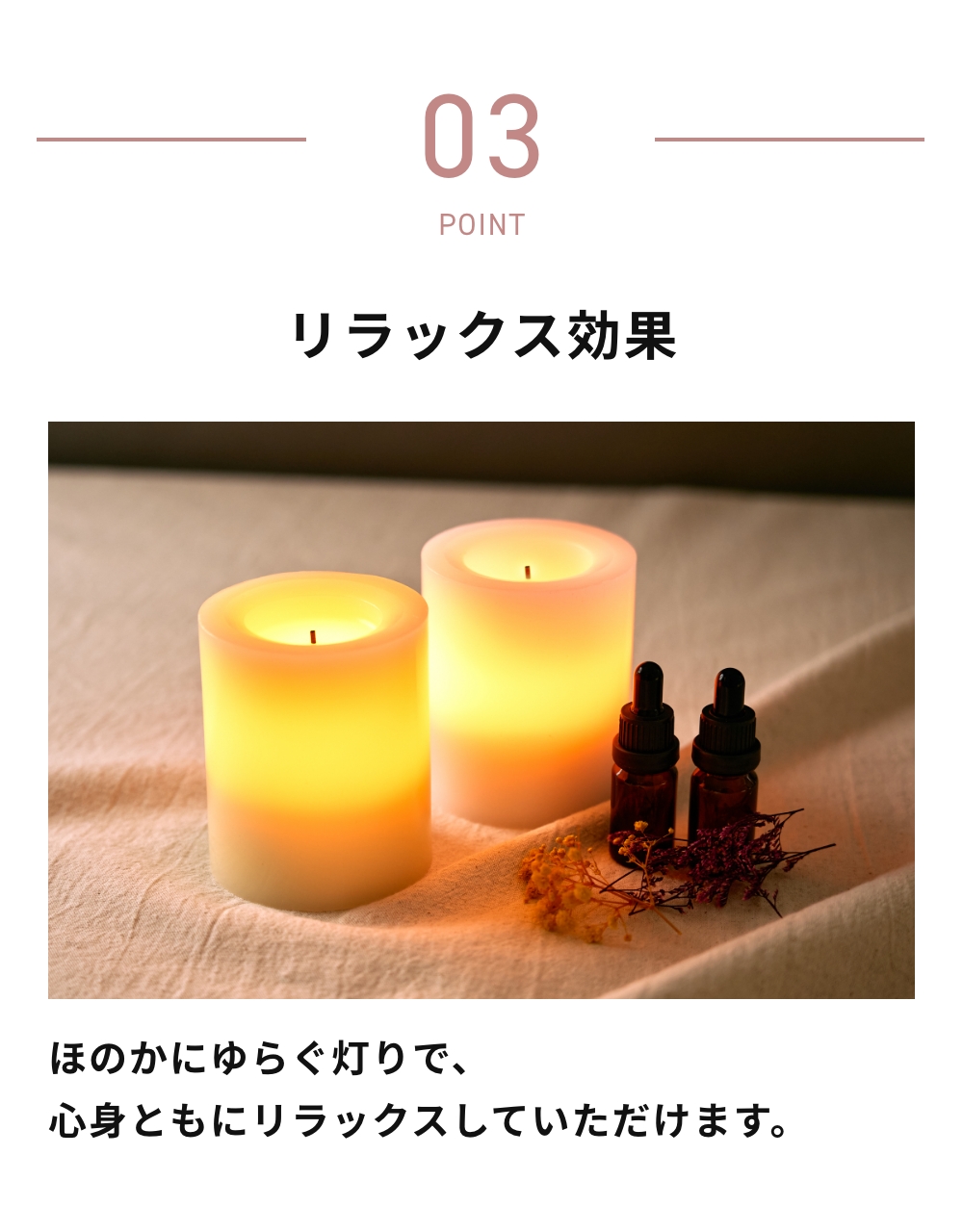 ほのかにゆらぐ灯りで、心身ともにリラックスしていただけます。