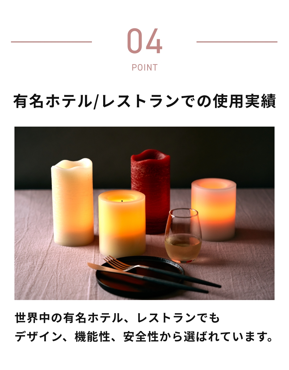 デザイン、機能性、安全性、全てを持ち合わせたフレームレスキャンドルは世界中の有名ホテル、レストランでも使用されています。