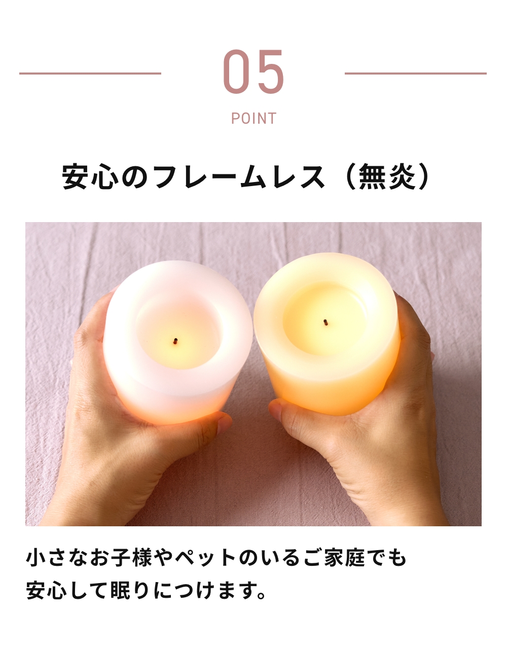 フレームレス(無炎)なので、小さなお子様やペットのいるご家庭やリラックスして眠りにつきたい時などにオススメです。