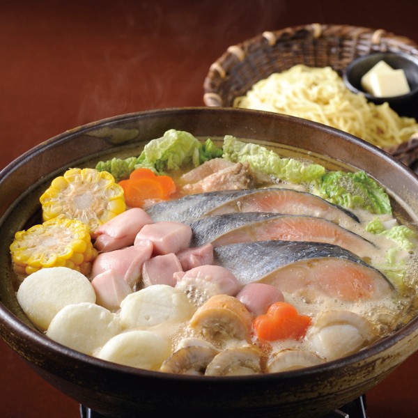 味噌仕立てのスープに野菜をたっぷり入れてお楽しみください。石狩鍋は、鮭が産卵のために遡上する石狩川が発祥の地といわれています。魚に傷をつけることなく加工するので、船上で活〆された秋鮭は鮮度のよさが違い、味もよくなります。味噌仕立てのスープにアラから旨みが溶け出し、バターでコクもプラスされて体が芯から温まります。[セット内容]秋鮭切身250g(4切)、ゆで帆立・秋鮭白子各100g、秋鮭アラ50g、バター8g×3、カットコーン×4、いももち×8、ラーメン180g、鍋用味噌30g×5