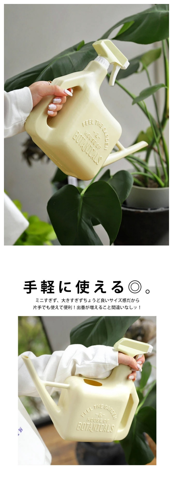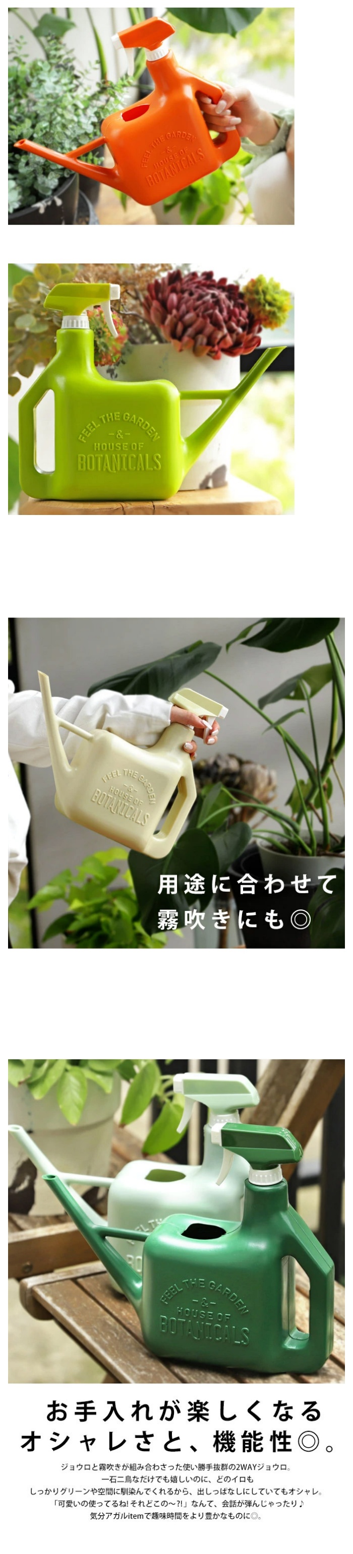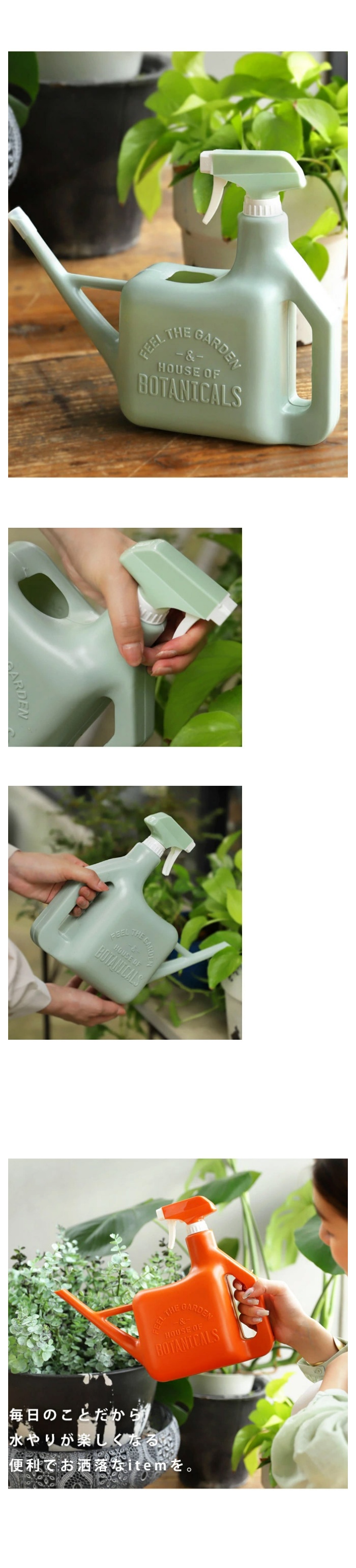 ジョウロと霧吹きが一体になった便利なデザインで、観葉植物やベランダガーデンのお手入れがこの一台で完結します。