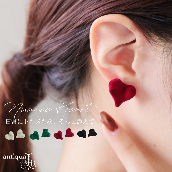 立体的でふっくらと丸みのあるハート形状が耳元でさりげなく映える、大人のためのアクセサリーです。