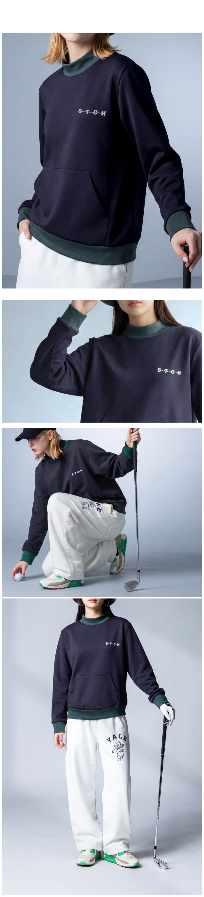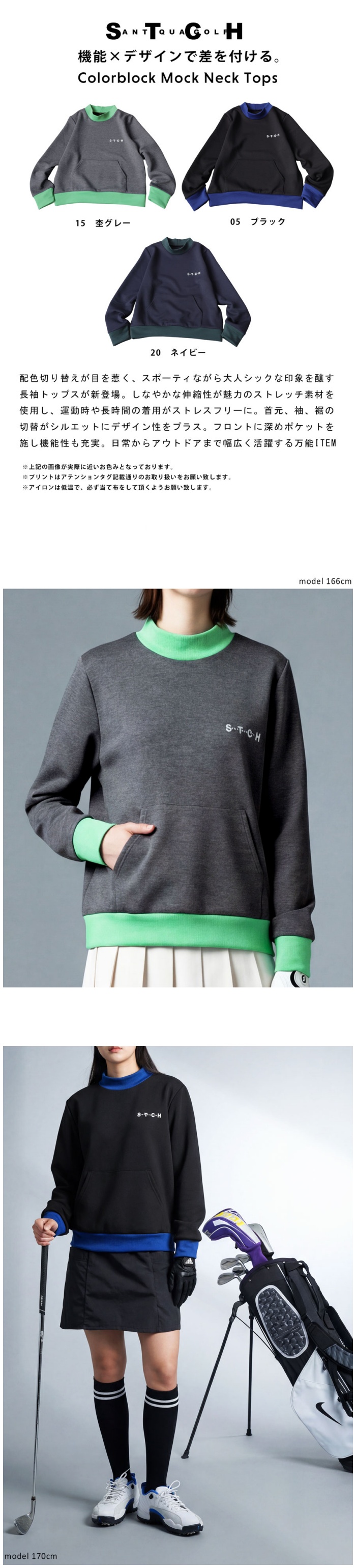 高すぎず低すぎないモックネックがネックラインを美しく見せ、バイカラーデザインがスポーティな雰囲気を演出します。
