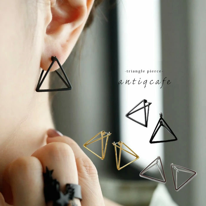 装いにひとさじのモード感を添える、三角フレームが印象的なキャッチレスピアス。