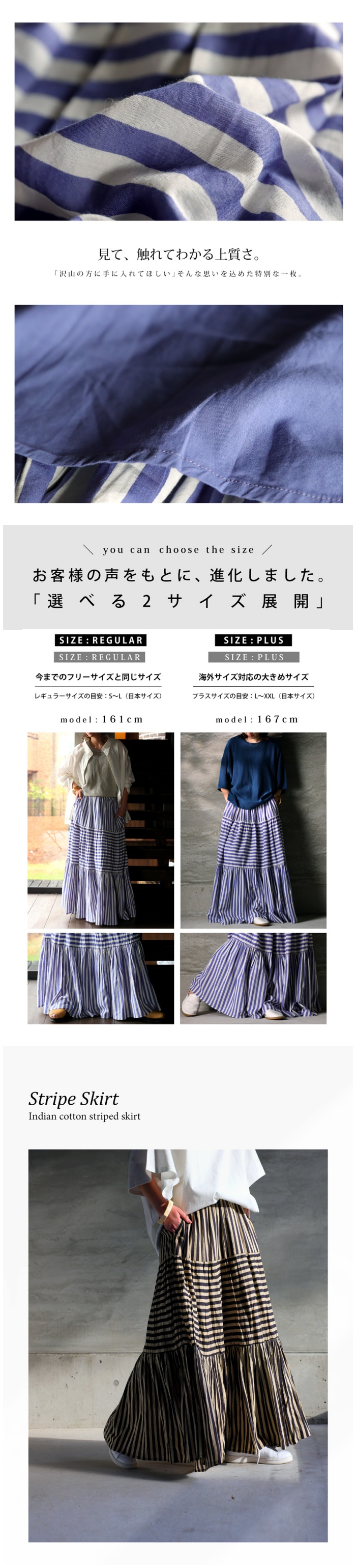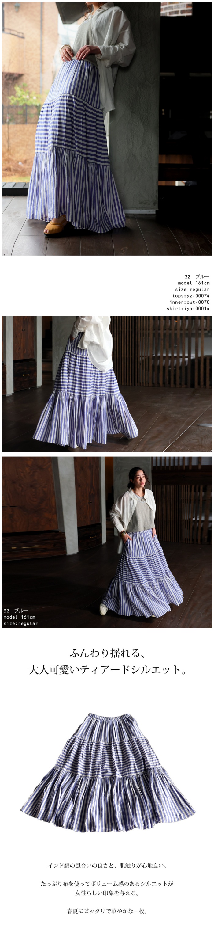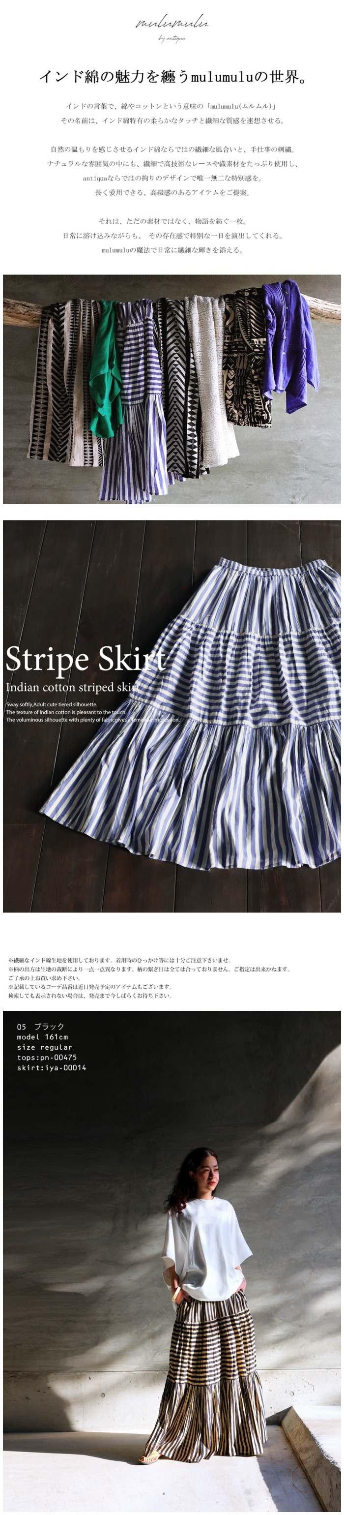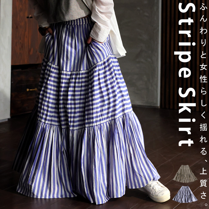 Please check the notes for this item and check this shipping note before you buy.【検索ワード】インド綿 ストライプスカート スカート レディース ボトムス ロング 柄 ストライプ柄 柄スカート 裏地付き ウエストゴム Aライン ポケット付き ギャザー フレア ティアードデザイン ゆったり サイズ展開 Regular Plus ナチュラル 高級感 シンプル 上品 綿 コットン ボリューム 体型カバー 細見え 華奢見え 大きめ 大きいサイズ ロングスカート フレアスカート ティアードスカート antiqua mulumulu アンティカ ムルムル 大人 おしゃれ 10代 20代 30代 40代 50代 60代 春 夏 お洒落 カジュアル かわいい かっこいい あんてぃか インド製 ジャイプール 繊細 手仕事 職人技