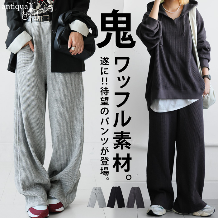 凹凸感のあるワッフル素材が目を惹く、大人のためのリラックスワイドパンツ。