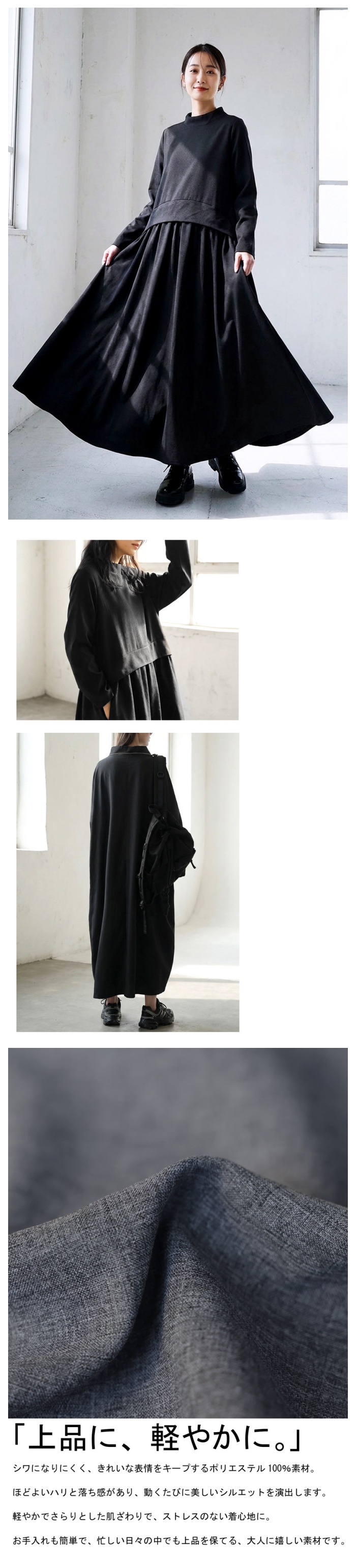シワになりにくいポリエステル100%素材は、軽やかでストレスフリーな着心地。