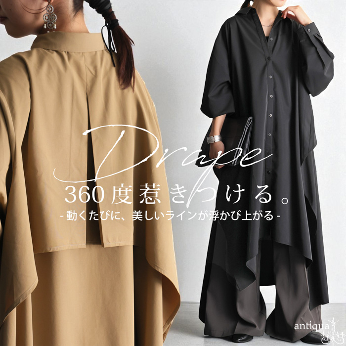 ネックラインをすっきり見せるシャツ襟(レギュラーカラー)が上品な印象を与えるドレープデザインのワンピースです。