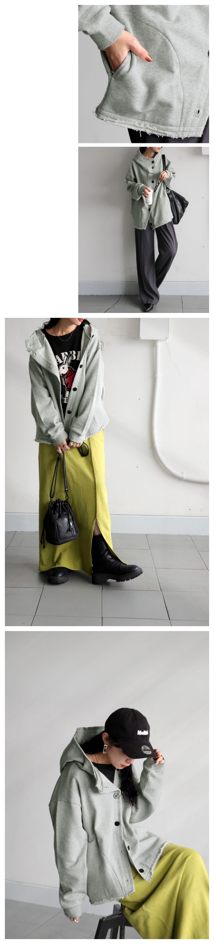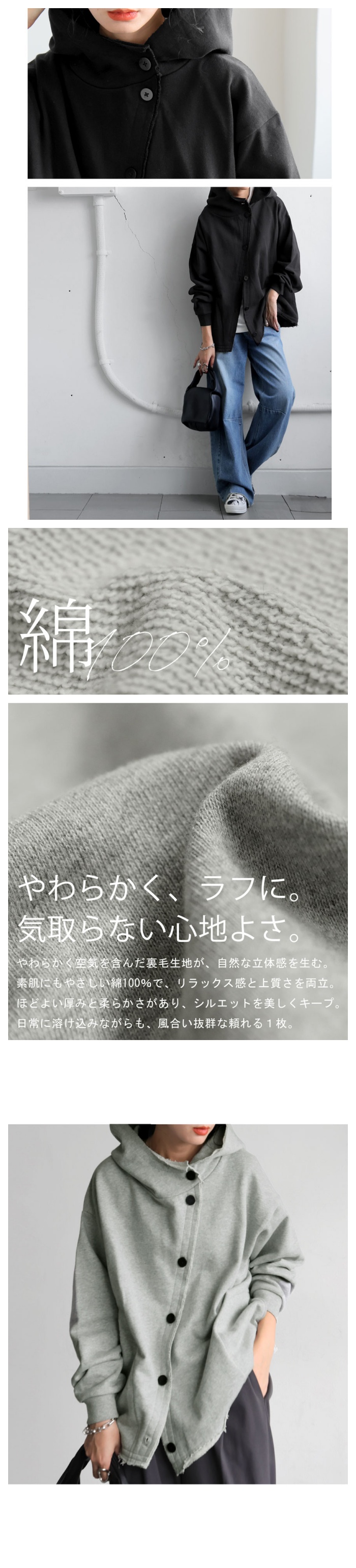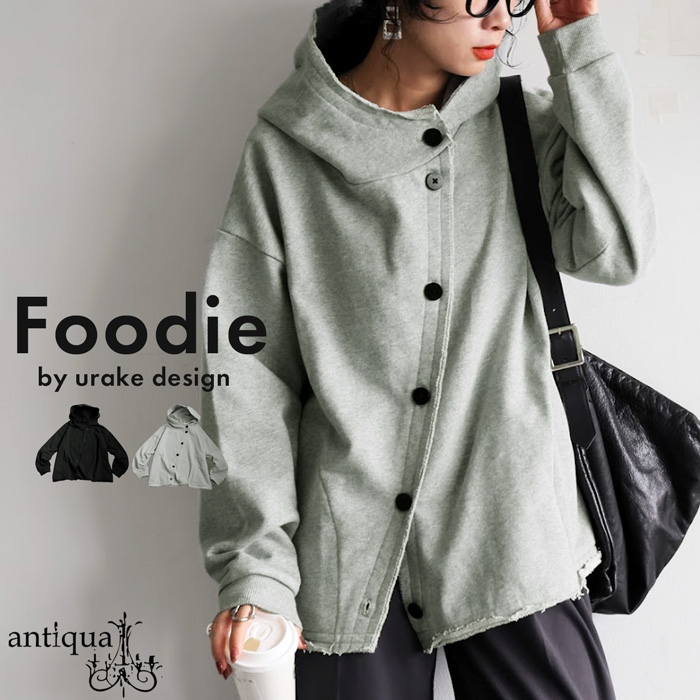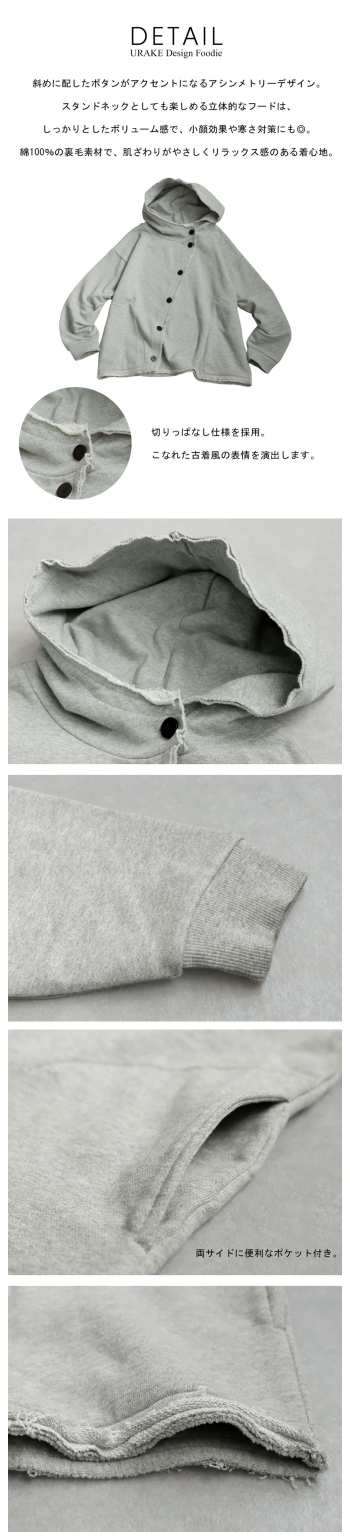 ネックラインは立体感あるフード付きのスウェットデザインで、顔まわりをすっきりと見せる形状。