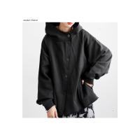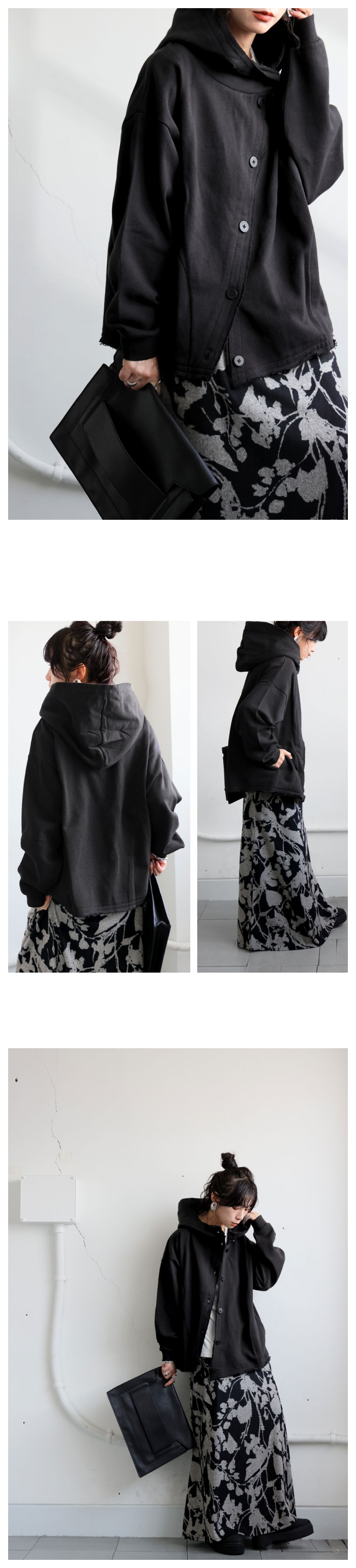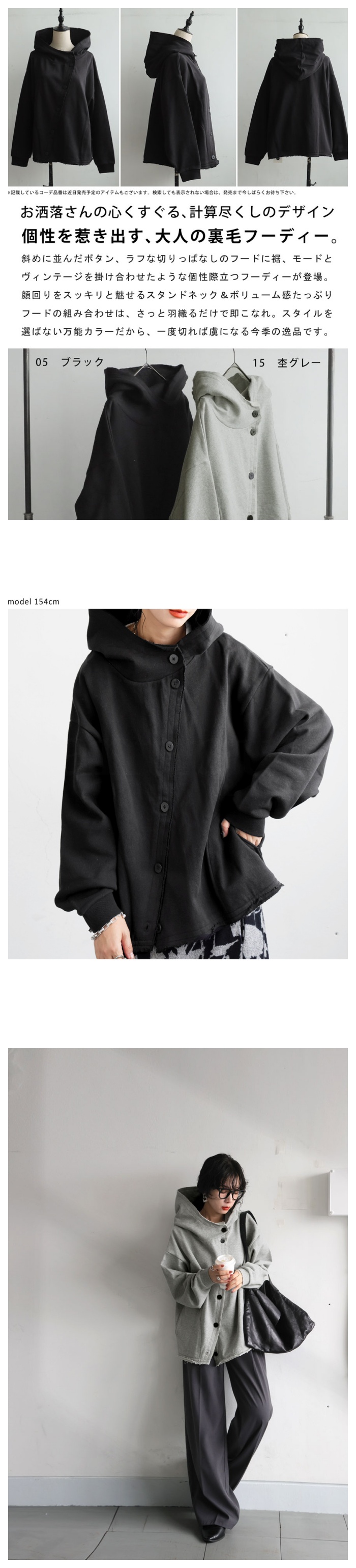 無地の中に映えるアシンメトリーなボタンデザインが印象的で、前を開けても閉めても雰囲気が変化。