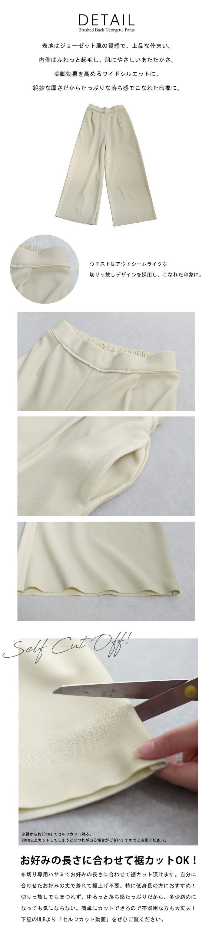 丈感はご自身で調整できるセルフカット仕様で、裾がほどけにくい設計が特長です。