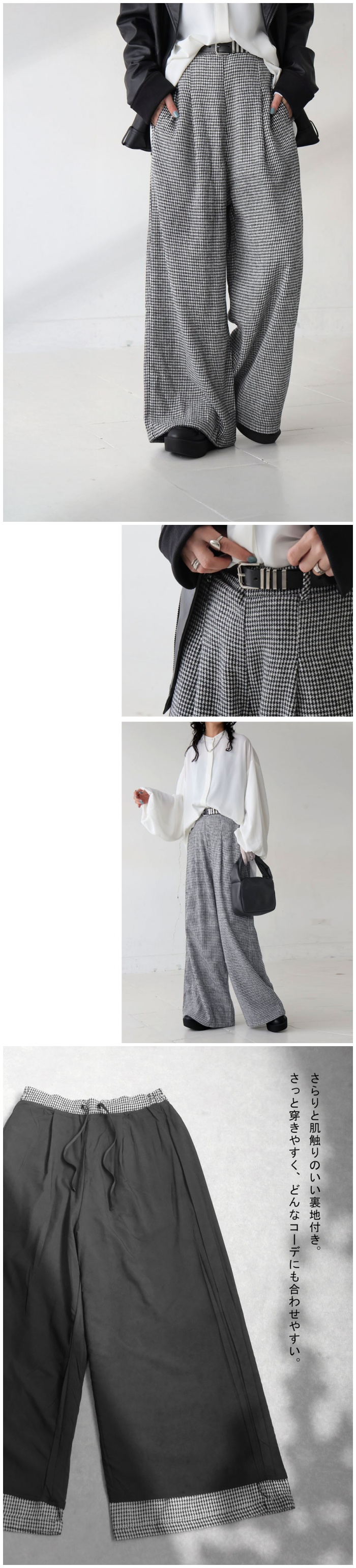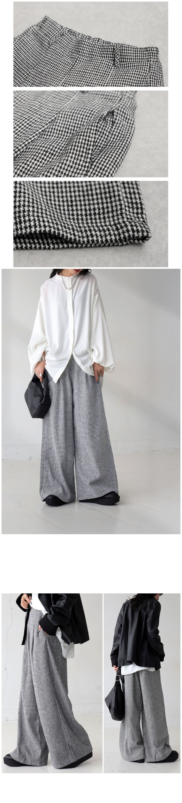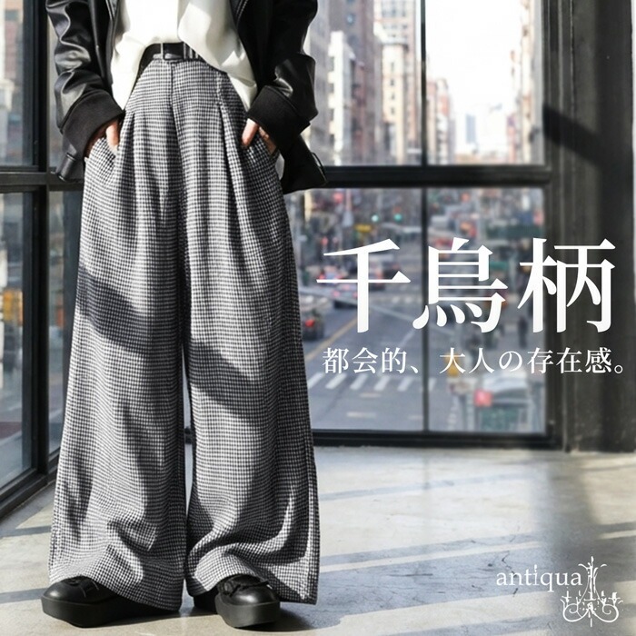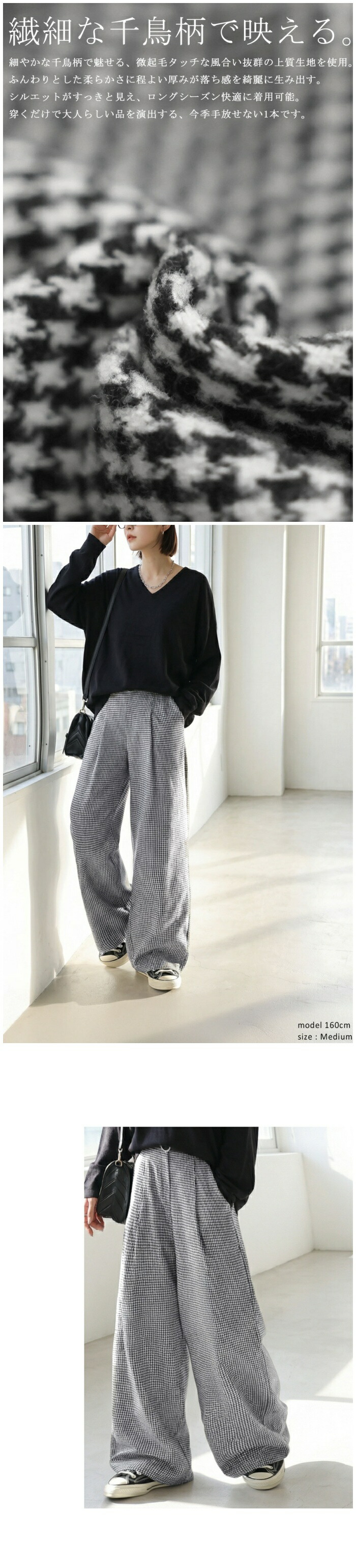 クラシックとモードを融合した千鳥柄ワイドパンツは、落ち着きと存在感を兼ね備えた一本です。