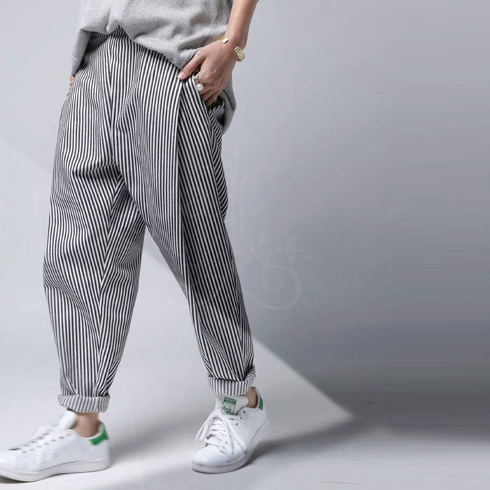 細いストライプ柄のテーパードが即こなれ魅せ。