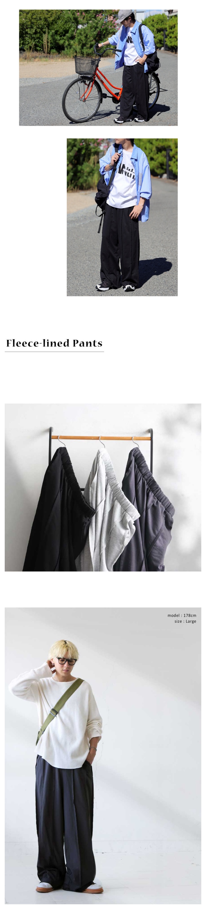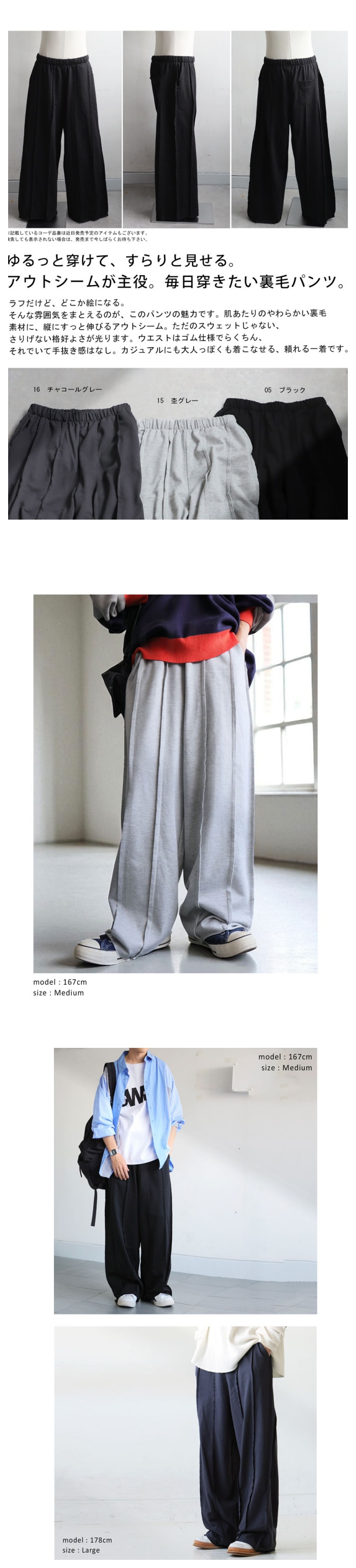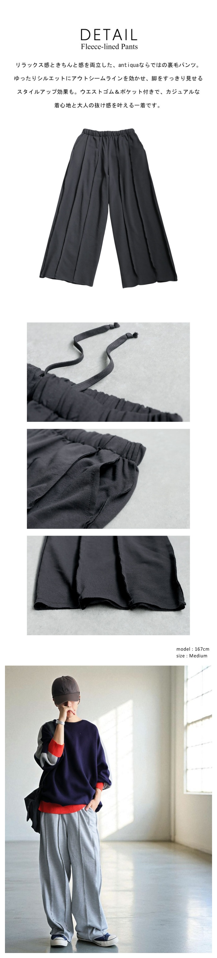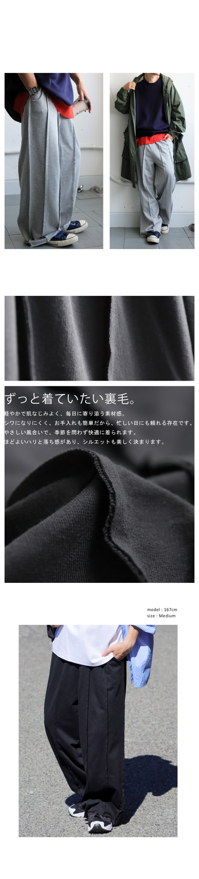 裏毛素材は厚すぎず軽やかで、ルームウェアのような快適さと街穿きのバランスを兼ね備えています。