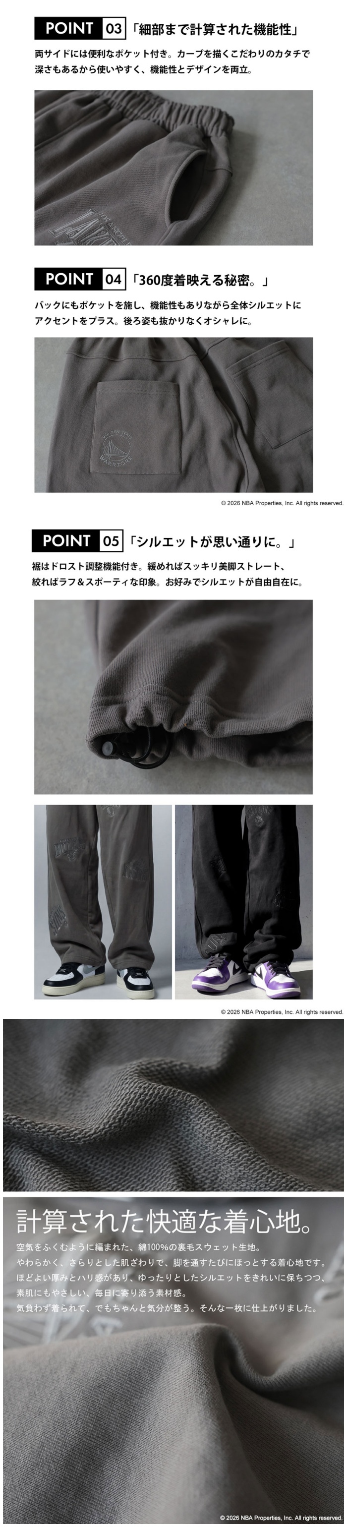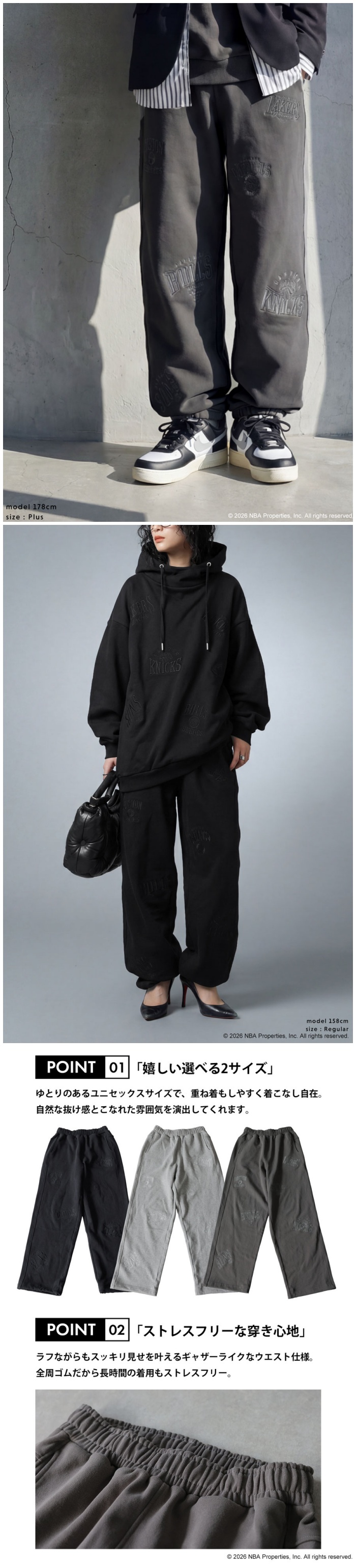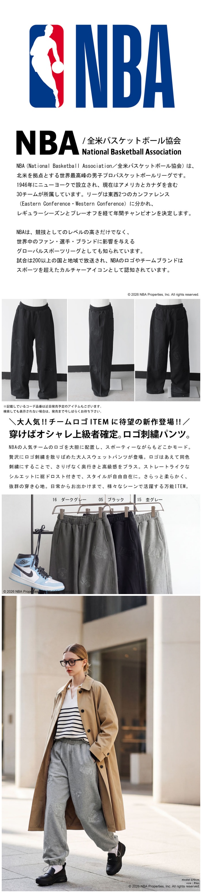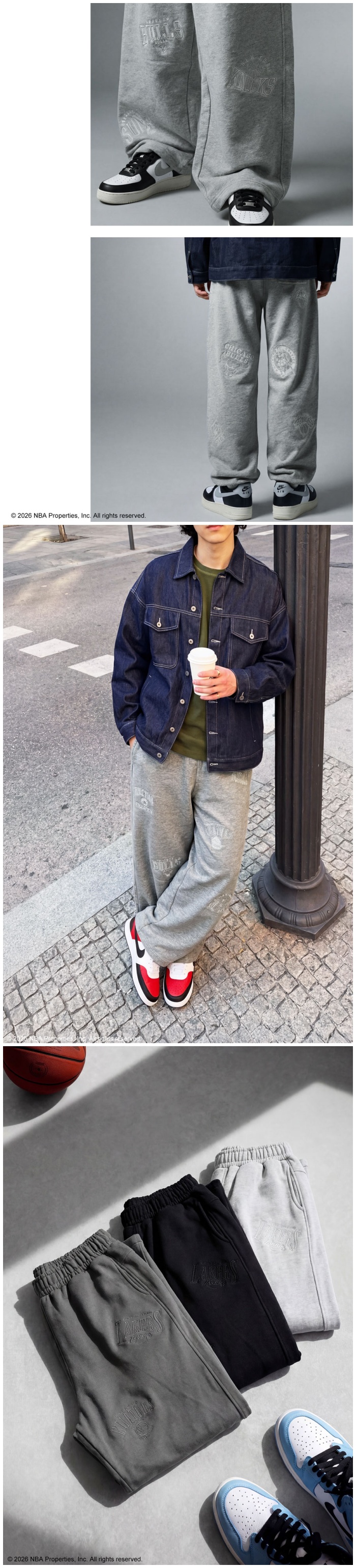 NBA公式ライセンスの刺繍ロゴを大胆に施した、綿100%のスウェットパンツ。