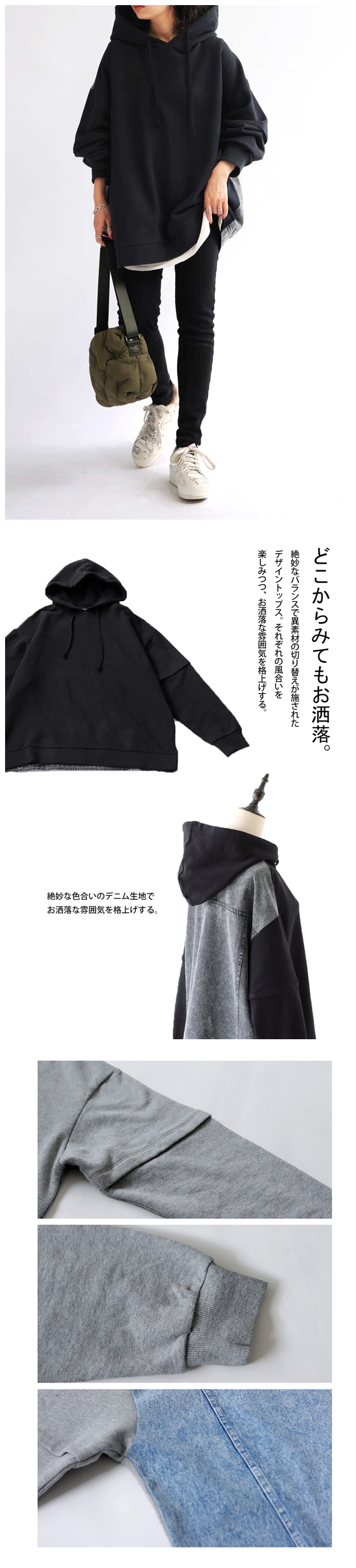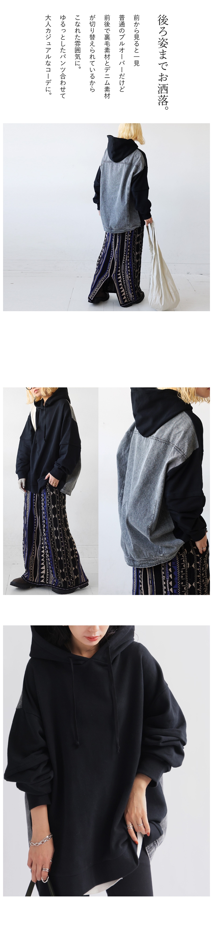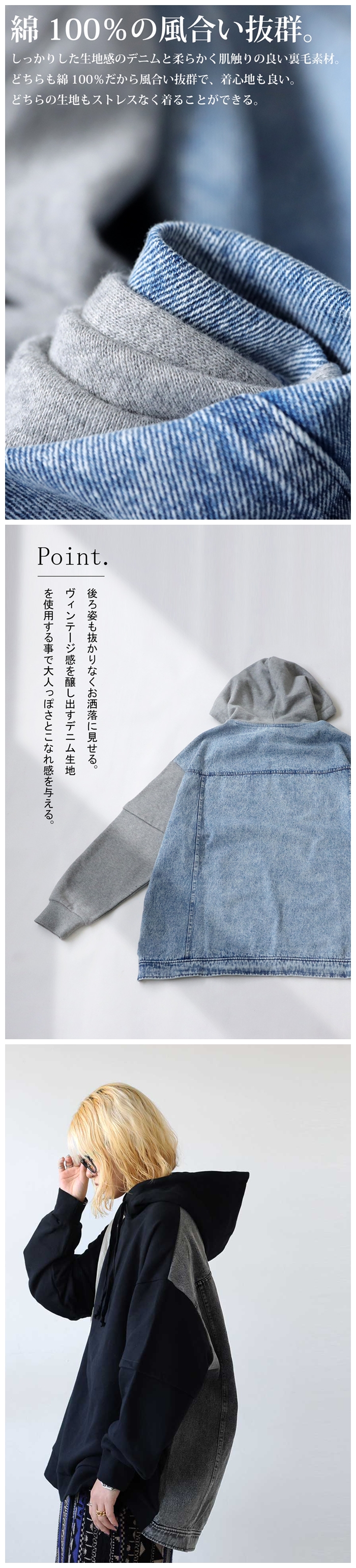 前身頃はミニ裏毛、後ろ身頃はデニム素材で仕上げ、どこから見てもお洒落な印象に。
