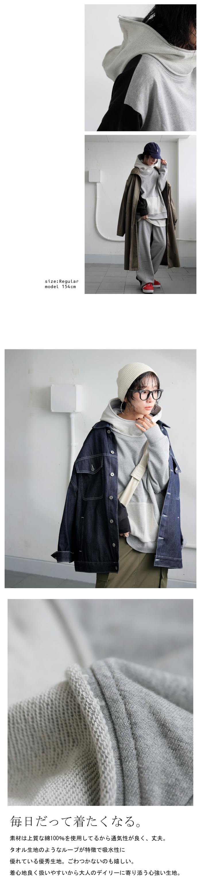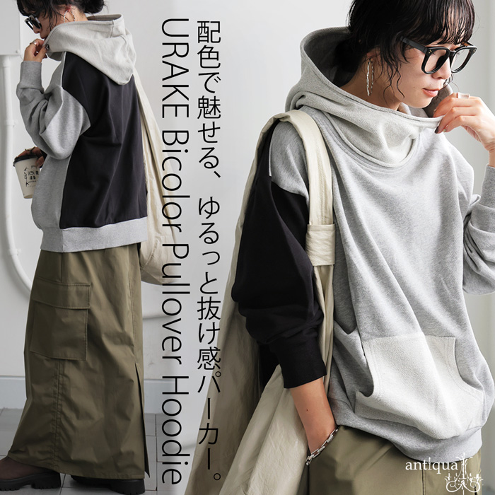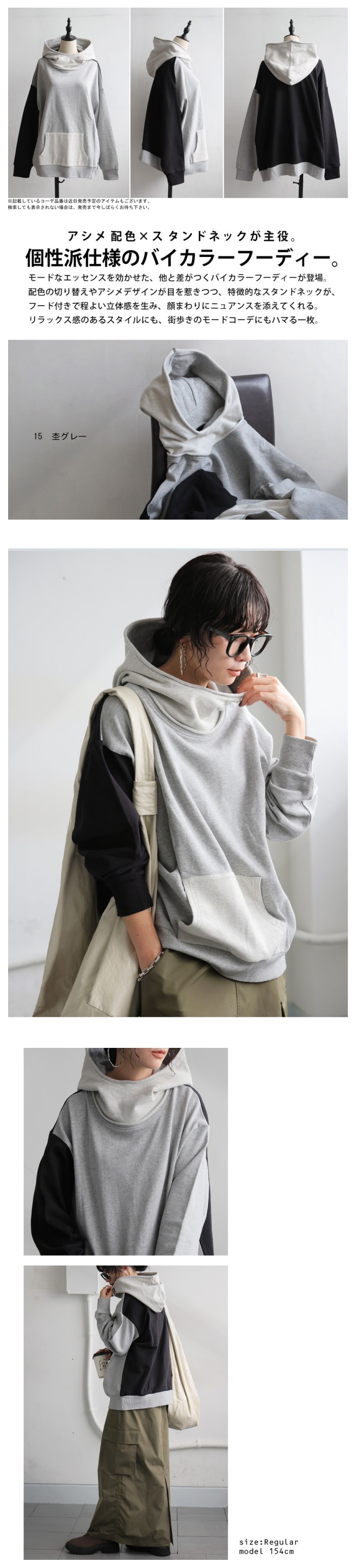 リラックス感とおしゃれ見えを両立した、裏毛素材の配色フーディー。