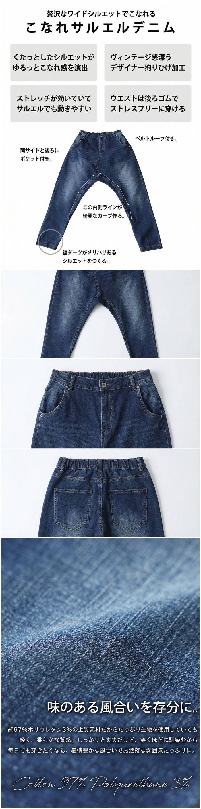 ジーンズならではの風合いに、サルエル特有のワイドでルーズな形状を掛け合わせた一本です。